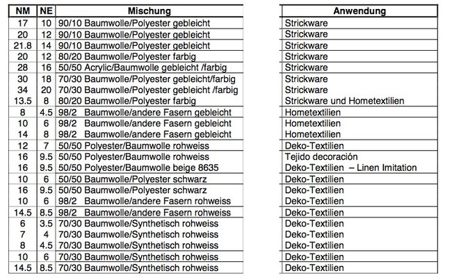 Nm 2,5 - Nm 30, bis 20 fach Zwirnung möglich• 100% Baumwolle • Baumwolle/Acryl, • Baumwolle/Polyester • Baumwolle/Leinen • Baumwolle/Viskose • Polyester/Viskose • Farbgarn Lagerprogramm